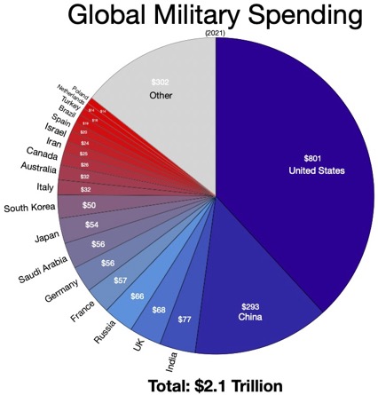 Not to ‘study war no more’ is captured in the African American Spiritual ‘Down by the Riverside’. We need to convert our military-driven economy to an economy which benefits people, and creates recyclable profits in human health, social and environmental-useful production. Global economies need to move from being extractive to being regenerative. Global military expenditure passed 2 trillion dollars, in 2021. (1) Many historians have repeated the maxim of African American sociologist and Pan African Civil rights activist, WE Burqhardt Du Bois that ‘the cause of war is the preparation for war’. (2) President Dwight Eisenhower, in his last presidential address in 1961 warned about the military-industrial complex, its undue and unearned influence and its potential to distort democratic processes. It later became styled the military-industrial-scientific complex, recognizing the potential for public policy to be held hostage by university military research and technological elites. Eisenhower drew attention to the fact that the US had not had an armaments industry until the Second World War and had relied on its manufacturers to turn their skills from the plowshare to the sword when need required. (3)
