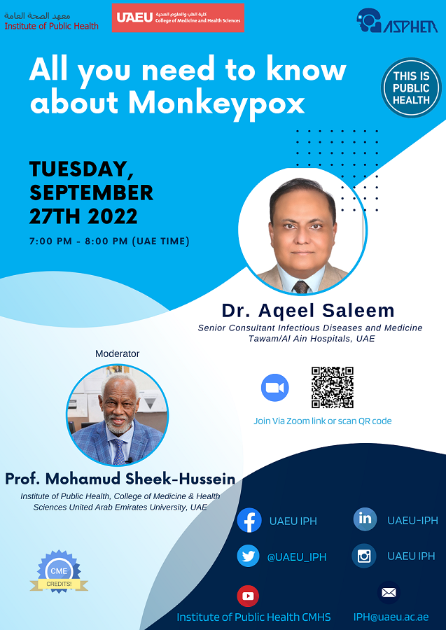 Join the webinar organized by the Institute of Public Health, College of Medicine and Health Sciences, United Arab Emirates University on the topic "All you need to know about Monkeypox" to be held on Tuesday, 27th September 2022 at 7:00 pm UAE time (3:00 pm GMT).