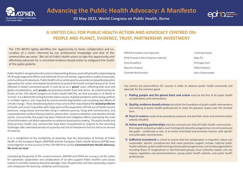 It is in recognition of the multiplicity of adversity, that the Association of Schools of Public Health in the European Region (ASPHER) and the European Public Health Alliance (EPHA) have come together on the occasion of the 17th WCPH to call for Concerted Public Health Advocacy. We must act now!