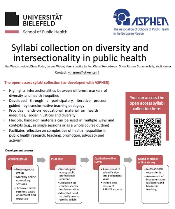 The overall aim of the syllabi is to help establish a teaching program encouraging the reconsideration of normativities within public health while highlighting the intersectionalities between different markers of diversity. The teaching programme adopts a transformative learning approach to contribute to higher sensitivity toward diversity and simultaneously higher standards of European public health education and training (Wandschneider et al., 2020).