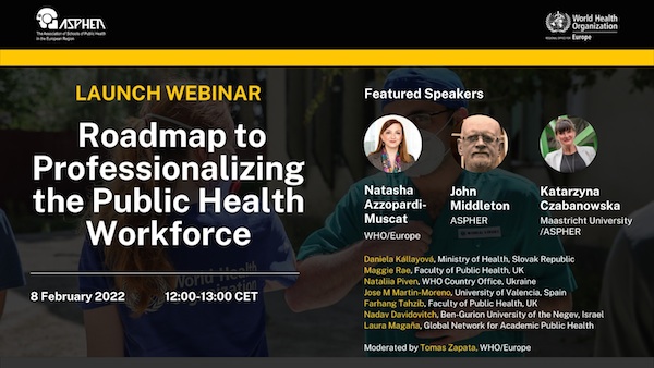 The WHO Regional Office for Europe and ASPHER are pleased to invite government officials, institutes of public health, ministries of health, public health authorities, professional organizations, schools and training centres for public health, employers and public health and health professionals to the launch webinar of this Roadmap to reflect on the need for professionalization of the public health workforce and discuss the way forward.