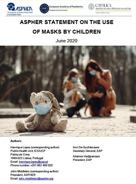 Previously, another Statement was produced by ASPHER dedicated to the use of masks and respirators in general. However, the particularities of the use of masks in children with the application of mandatory use of masks in many situations during the lockdown de-escalation period led ASPHER to take a stand given the enormous difficulties verified in its use all over the world.