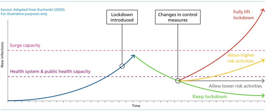 The transition out of lockdown is complex and involves judgements which must balance the potential for a second catastrophic wave of infection, versus continued damage to health through lockdown measures, and through damage to the economic and social fabric of societies.