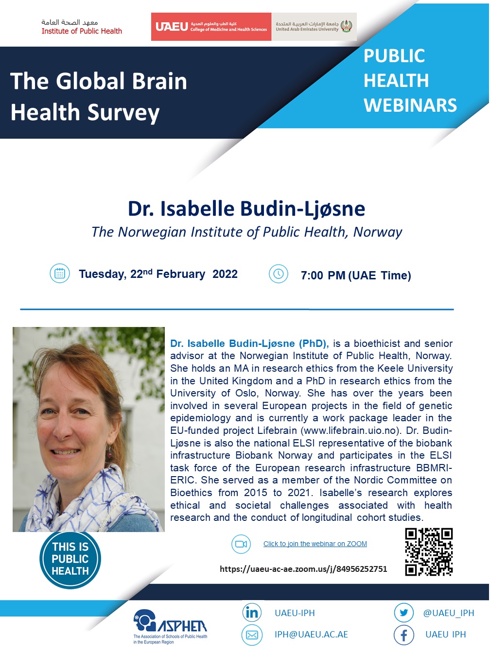 ASPHER is the key independent European organisation dedicated to strengthening the role of public health by improving education and training of public health professionals for both practice and research.Home » Aspher repository » Special Announcements » IPH Public Health webinar on The Global Brain Health Survey by Dr. Isabelle Budin-Lj????sne from The
